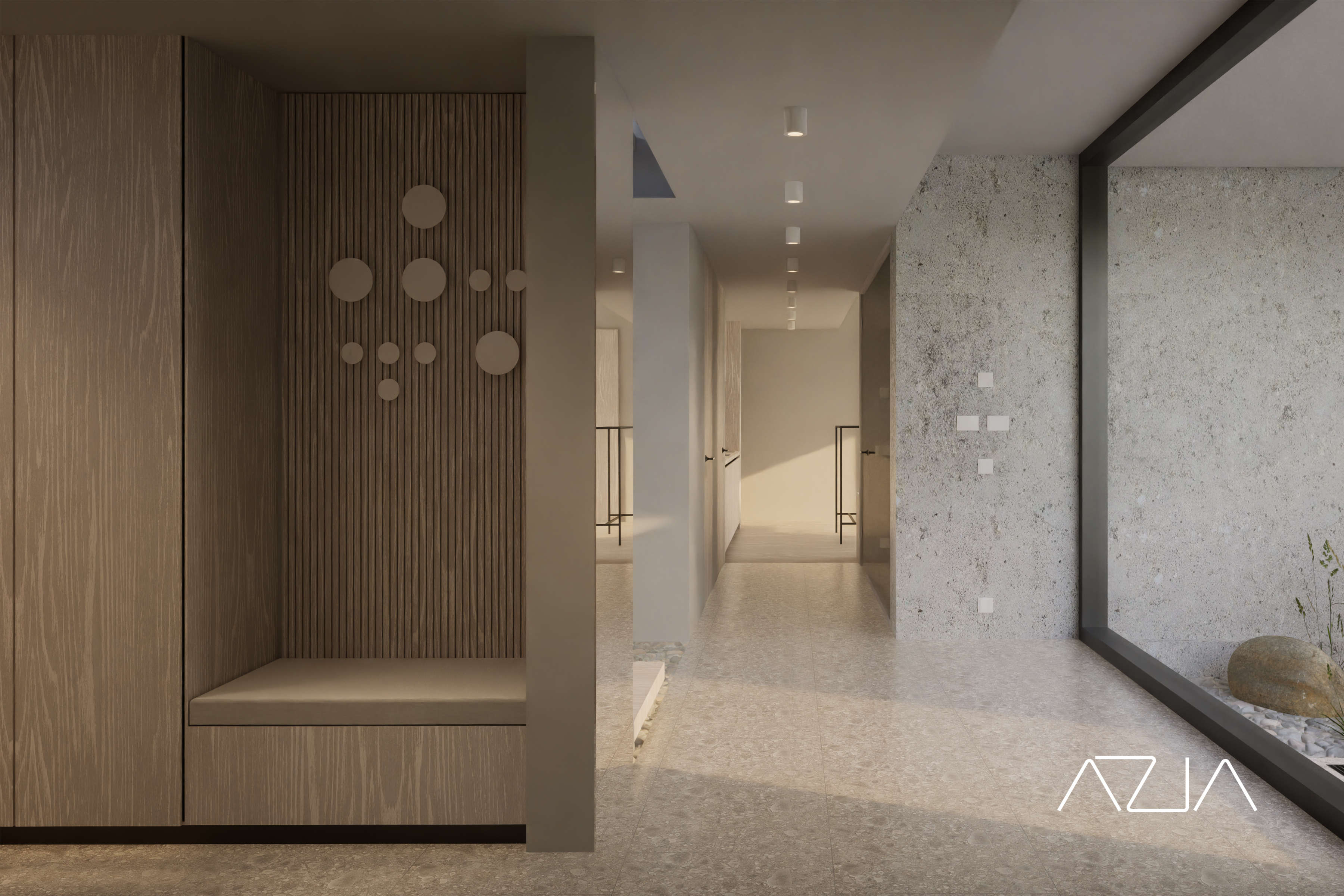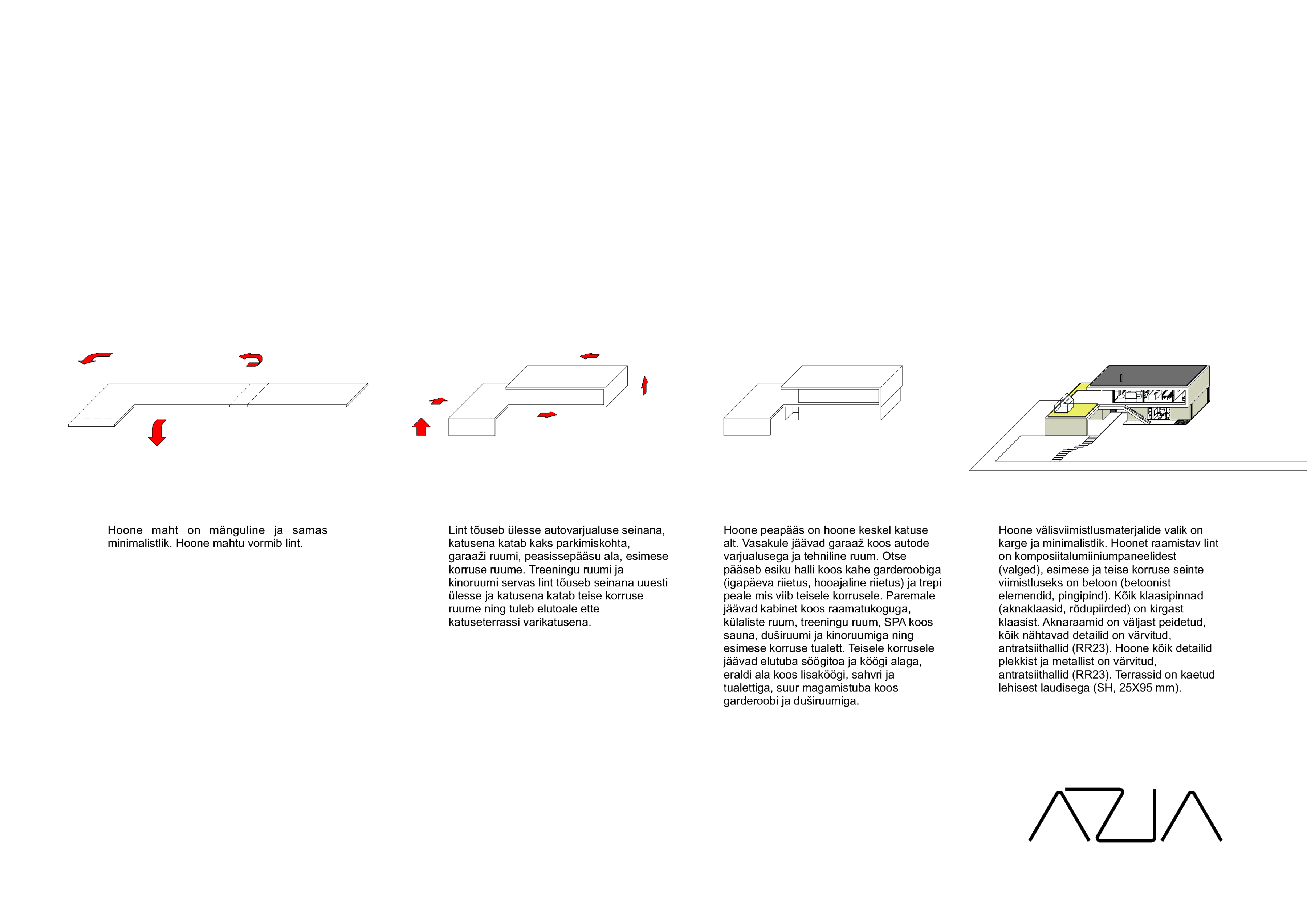 Hoone maht on mänguline ja samas minimalistlik. Hoone mahtu vormib lint. Lint tõuseb ülesse autovarjualuse seinana, katusena katab kaks parkimiskohta, garaaži ruumi, peasissepääsu ala, esimese korruse ruume. Treeningu ruumi ja kinoruumi servas lint tõuseb seinana uuesti ülesse ja katusena katab teise korruse ruume ning tuleb elutoale ette katuseterrassi varikatusena. Hoone peapääs on hoone keskel katuse alt. Vasakule jäävad garaaž koos autode varjualusega ja tehniline ruum. Otse pääseb esiku halli koos kahe garderoobiga (igapäeva riietus, hooajaline riietus) ja trepi peale mis viib teisele korrusele. Paremale jäävad kabinet koos raamatukoguga, külaliste ruum, treeningu ruum, SPA koos sauna, duširuumi ja kinoruumiga ning esimese korruse tualett. Teisele korrusele jäävad elutuba söögitoa ja köögi alaga, eraldi ala koos lisaköögi, sahvri ja tualettiga, suur magamistuba koos garderoobi ja duširuumiga.